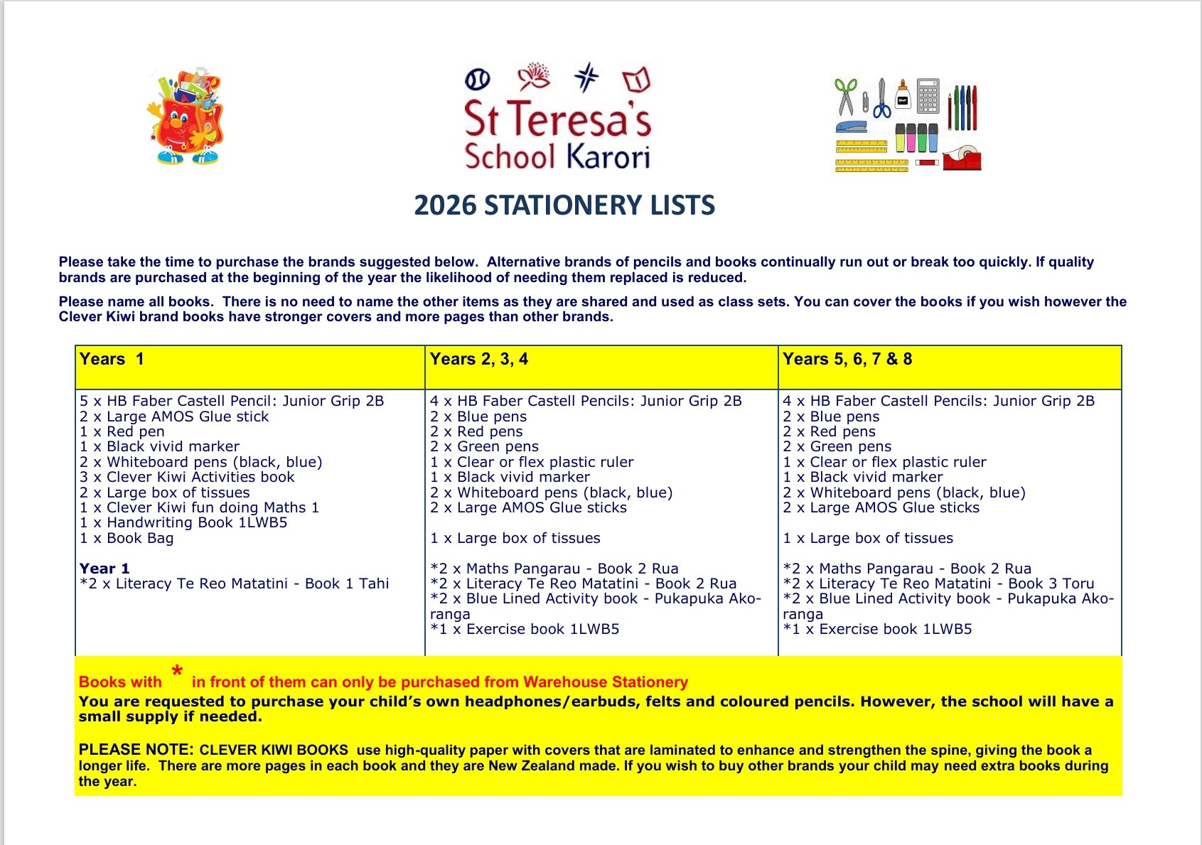 Please name all books. There is no need to name the other items as they are shared and used as class sets. You can cover the books if you wish however the Clever Kiwi brand books from the Warehouse Stationery have stronger covers and more pages than other brands.