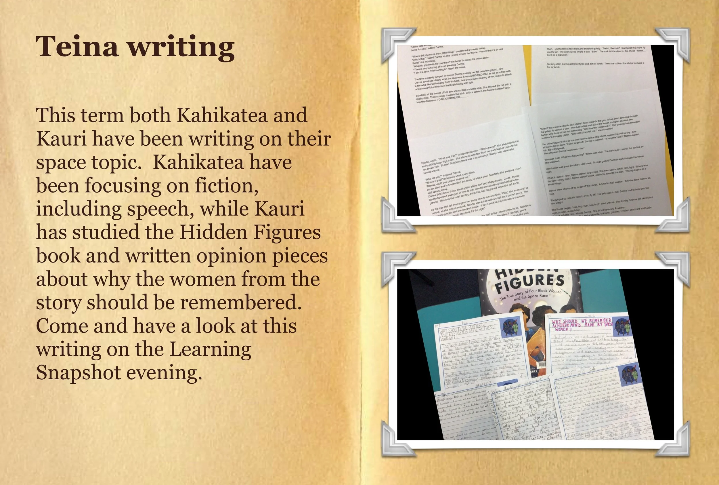 Teina has been writing up a storm this term, based on our space topic. Come to the Learning Snapshot evening to read your childs!